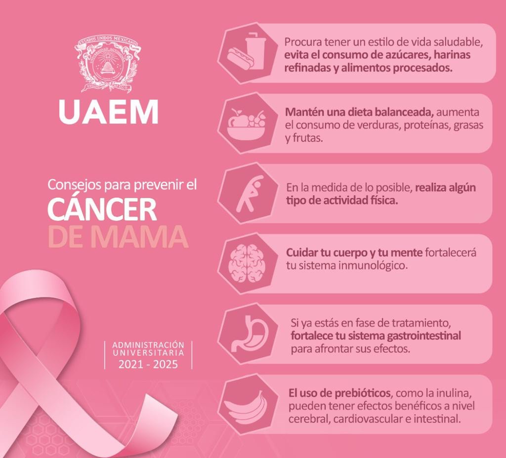 Toluca, Estado de México, 19 octubre 2021.- Un estilo de vida saludable que descarte el consumo constante de azúcares, harinas refinadas, alimentos procesados y contemple la actividad física es fundamental para ayudar a prevenir el cáncer de mama y, en caso de padecerlo, confrontar los tratamientos que conlleva, como las quimioterapias, aseguró la investigadora de la Facultad de Medicina, de la Universidad Autónoma del Estado de México (UAEM), Alexandra Estela Soto Piña.