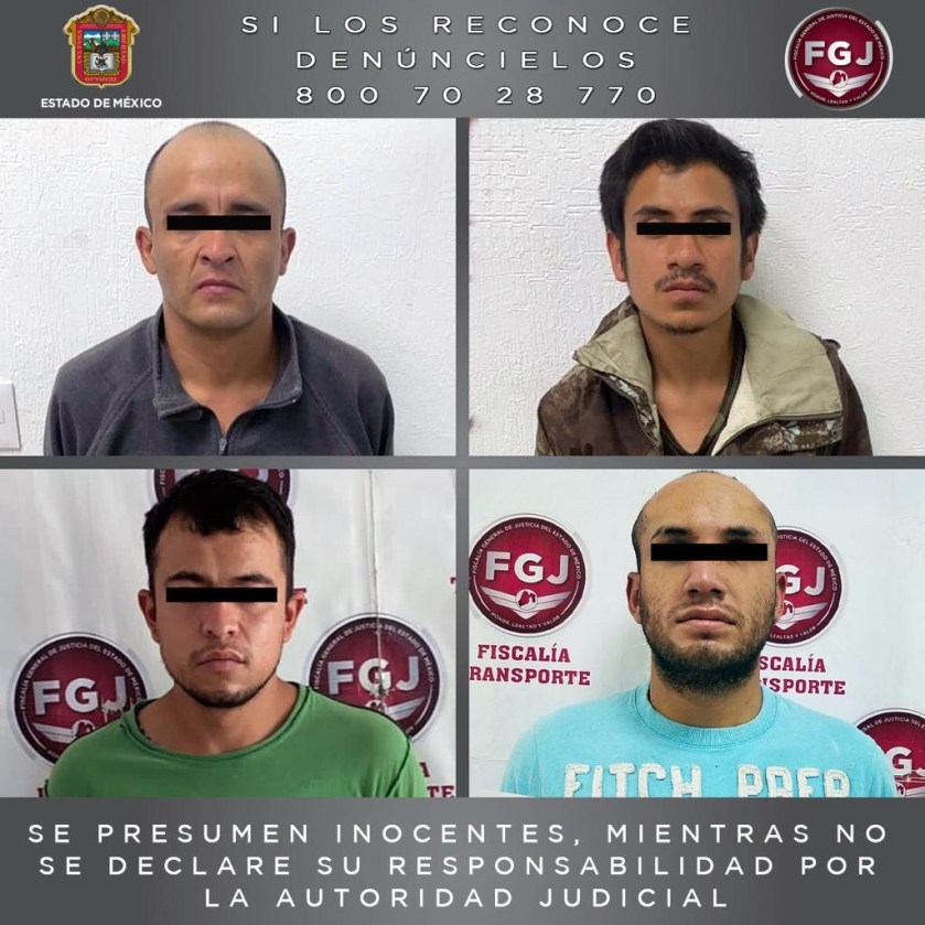 Los detenidos son Miguel Ángel “N”, Alberto “N”, Salvador “N” y Ulises Erick “N”, quienes son investigados por ilícitos ocurridos en los municipios de Ecatepec y Tlalnepantla.