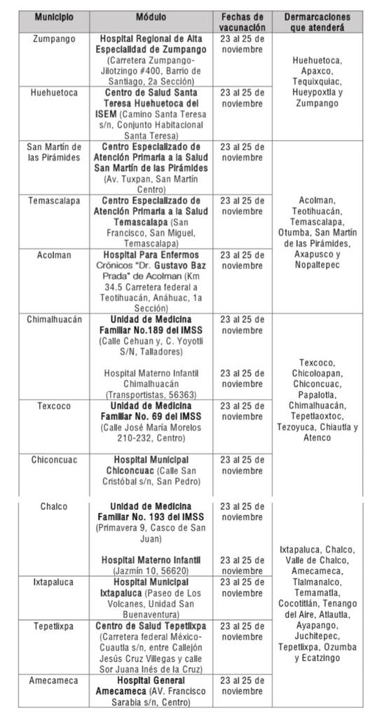 • Pueden consultar sedes, horarios y requisitos en el sitio web http://edomex.gob.mx/vacunacion.