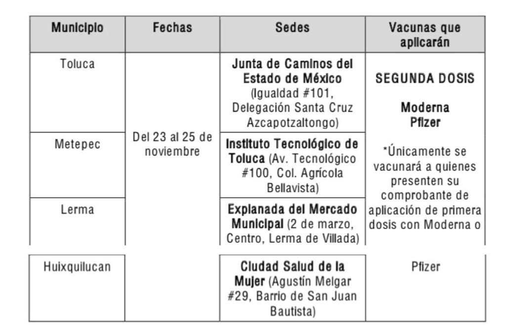 A partir del martes 23 de noviembre se habilitarán nuevas sedes para inmunizar a menores de 12 a 17 años con alguna comorbilidad o factor de riesgo, así como para aplicar segundas dosis a personas rezagadas mayores de 18 años en Toluca, Metepec, Lerma y Huixquilucan.
