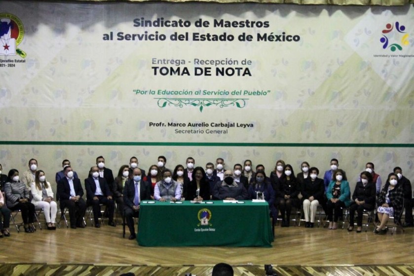 El Secretario General del SMSEM, Marco Aurelio Carbajal Leyva, afirmó que se adhieren al pacto signado por la legalidad y el Estado de Derecho, y agregó que con la Toma de Nota se les acredita como representantes legítimos del magisterio estatal ante las diversas instancias del Gobierno del Estado de México.