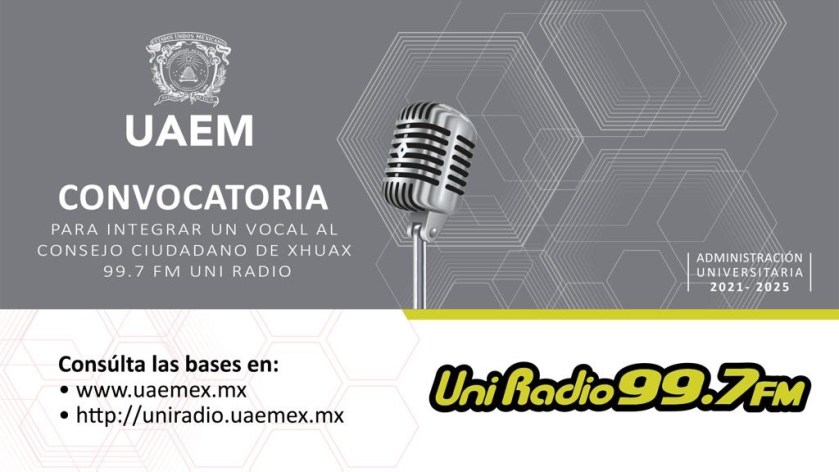 Toluca, Estado de México, 30 noviembre 2021.- Para fortalecer la misión del Consejo Ciudadano de la estación XHUAX 99.7 FM Uni Radio como un órgano plural de representación social, se publicó la convocatoria para elegir a uno de sus vocales, acto de transparencia mediante el cual la Universidad Autónoma del Estado de México (UAEM) da cumplimiento a diversas disposiciones legales, entre ellas, la Ley Federal de Telecomunicaciones y Radiodifusión.