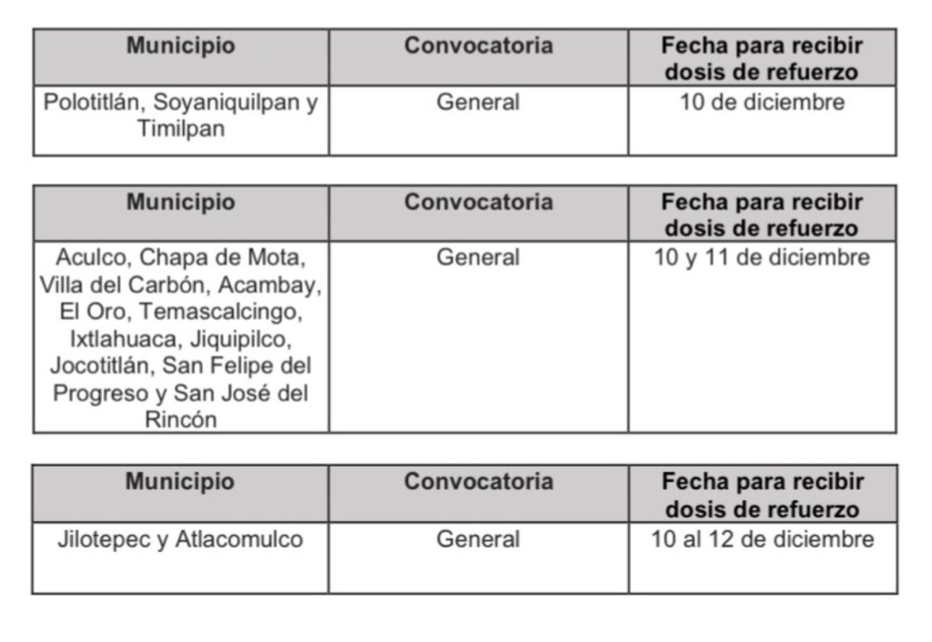 Del viernes 10 al domingo 12 de diciembre se llevará a cabo la aplicación de la vacuna de refuerzo contra COVID- 19 para adultos mayores de 60 años en 16 municipios mexiquenses.