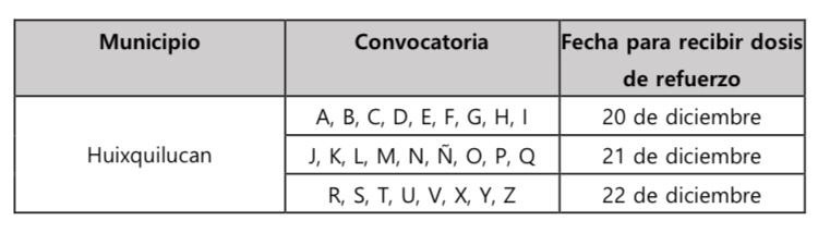 Del lunes 20 al miércoles 22 de diciembre se aplicará la dosis de refuerzo contra COVID-19 para adultos mayores que hace más de seis meses hayan completado su esquema primario de inmunización, en el municipio de Huixquilucan.