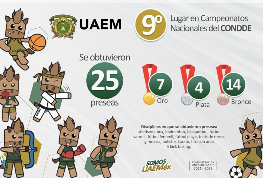 Toluca, Estado de México, 14 enero 2022.- Destacada actuación tuvo la delegación de la Universidad Autónoma del Estado de México (UAEM) que participó en los campeonatos nacionales del Consejo Nacional del Deporte de la Educación (CONDDE), al ocupar el noveno lugar de la clasificación general y contabilizar 25 preseas: 7 de oro, 4 de plata y 14 de bronce.