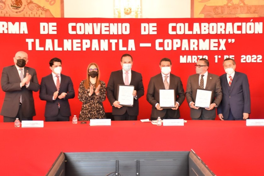 Tlalnepantla de Baz, Estado de México, 01 marzo 2022.- El Gobierno de Tlalnepantla y la Coparmex firmaron el convenio de colaboración para emprender acciones conjuntas en materia de seguridad y que ello impacte de manera directa en la reactivación económica de la localidad, tras los efectos que ha dejado la pandemia.