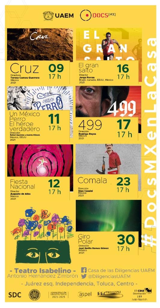 - Como parte de este programa, en la “Casa de las Diligencias” se proyectarán siete documentales mexicanos elaborados durante el año 2021: Cruz, Un México Perro, Fiesta Nacional, El gran salto, 499, Comala y Giro Polar.