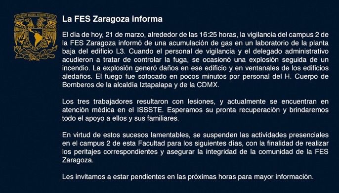 El día de hoy, 21 de marzo, alrededor de las 16:25 horas, la vigilancia del campus 2 de la FES Zaragoza informó de una acumulación de gas en un laboratorio de la planta baja del edificio L3. Cuando el personal de vigilancia y el delegado administrativo acudieron a tratar de controlar la fuga, se ocasionó una explosión seguida de un incendio. La explosión generó daños en ese edificio y en ventanales de los edificios aledaños. El fuego fue sofocado en pocos minutos por personal del H. Cuerpo de Bomberos de la Alcaldía Iztapalapa y de la CDMX.