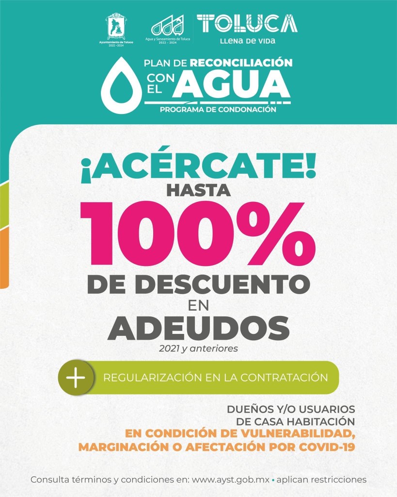 El presidente municipal de Toluca, Raymundo Martínez Carbajal, anunció el llamado Programa Municipal de Condonacion: Plan de Reconciliación Nacional, para que aquellos usuarios con rezago en pagos con el Organismo Agua y Saneamiento obtengan el 100 por ciento de condonación de adeudos anteriores al 2021, al igual que para contribuyentes con tomas irregulares. Para ello, los usuarios deben pertenecer a la comunidad otomi de la zona norte del municipio, o bien acrediten condición de vulnerabilidad, de marginación e incluso, aquellos que prueben afectación por COVID-19.