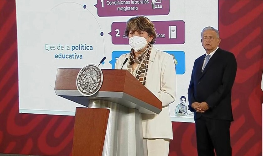 Delfina Gómez Álvarez encabezó la presentación del informe de avances alcanzados por la SEP en cuatro ejes; el primero es la atención y respeto a docentes, su situación laboral, vacunación contra COVID-19 y la importancia de su participación en la elaboración del currículum.