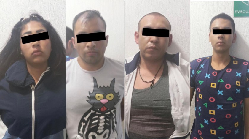 Las personas detenidas son Nazario “N”, de 31 años; Norma Elizabeth “N”, de 23; Francisco Sergio “N”, de 26, y Miguel Ángel “N”, de 21, a quienes se les encontraron dos réplicas de arma de fuego, una navaja de 13 centímetros de largo, y una piedra color blanco conocida como cristal, con características propias de la metanfetamina.