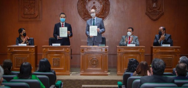 El rector de la UAEMéx, Carlos Eduardo Barrera Díaz, suscribió dos convenios de colaboración general y específico con el titular de la Secretaría de la