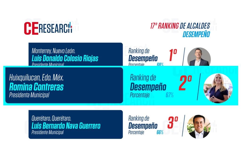 Los resultados de la medición de C&E Research se suman a los que han hecho públicos otras casas encuestadoras, como Demoscopia, Rubrum, Propol y Massive Caller, en donde la alcaldesa Romina Contreras Carrasco ha obtenido una aprobación ciudadana promedio de 65.3 por ciento, la más alta de los presidentes municipales del Estado de México desde que iniciaron las administraciones municipales 2022-2024, y en donde ningún otro edil ha logrado colocarse por seis meses consecutivos.