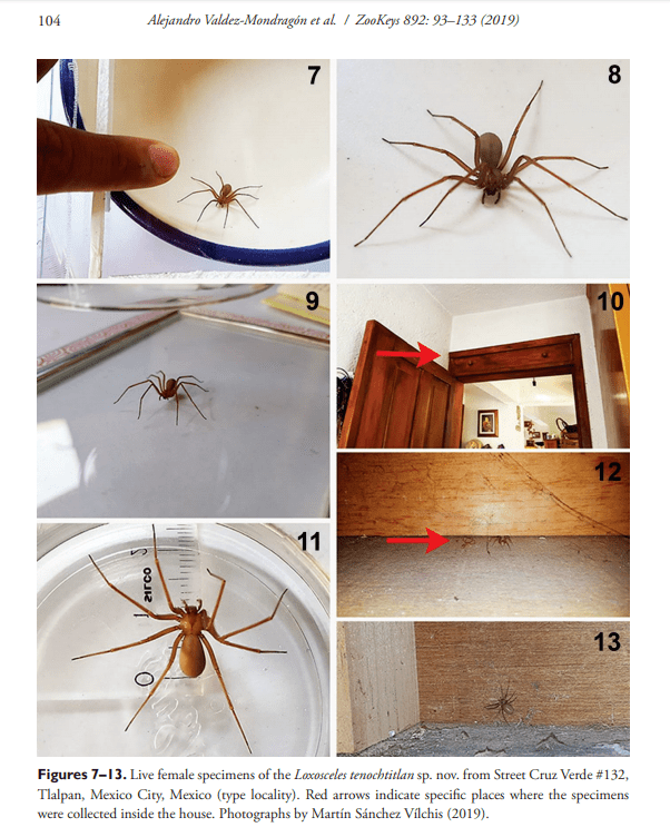 Alejandro Valdez Mondragón, Claudia Navarro-Rodríguez, Karen Solís-Catalán, Mayra Cortez-Roldán y Alma Juárez-Sánchez condujeron una investigación por medio de la cual se halló que esta especie, conocida como loxosceles tenochtitlan, difiere de otras tanto morfológicamente como en su ADN.