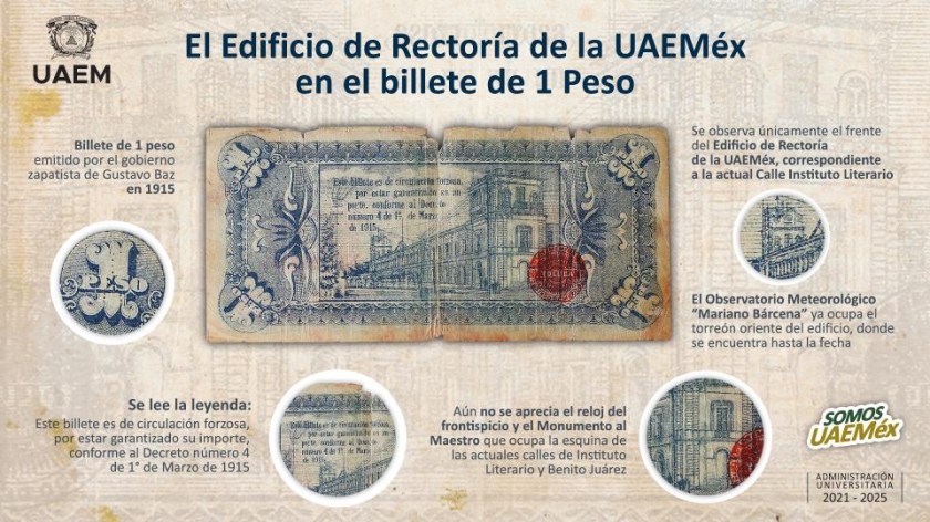 Para la comunidad de la Universidad Autónoma del Estado de México (UAEMéx) hay un billete que destaca por su singularidad, principalmente por el momento de la historia de nuestro país en el que se manufacturó: el de 1 peso que en el reverso tiene como imagen principal el Edificio de Rectoría de esta casa de estudios.