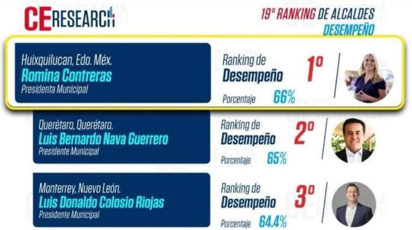 De acuerdo con el 19 Ranking de Alcaldes, correspondiente al mes de agosto, Romina Contreras obtuvo la calificación más alta en la evaluación de Desempeño entre 60 alcaldes de México, al conseguir un respaldo de 66 por ciento por parte de los ciudadanos a los que representa, el más alto en todo México.