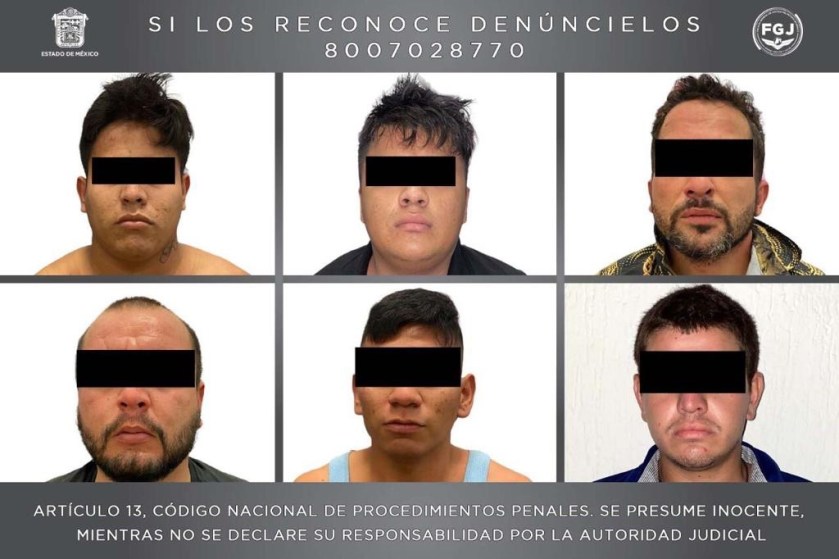 Se trata de Rubén “N”, alias “Barbas”, de 32 años; Ricardo “N”, alias “Callo”, de 22 años; Edgar Iván “N”, alias “Chore”, de 19 años; Jesús Martín “N”, alias “Fantasma”, de 41 años, Alexis “N”, alias “El Gordo”, de 18 años y Susano Ismael “N”, alias “El May”, de 22 años, quienes al parecer son integrantes de una célula delictiva dedicada a varias actividades ilícitas en la región sur de la entidad mexiquense y habrían secuestrado a una joven en esta región de la entidad mexiquense.
