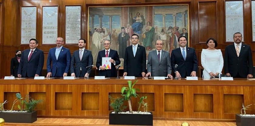 Toluca, Estado de México, 12 de septiembre de 2022. Con tolerancia, concertación y colaboración entre los poderes públicos, se propicia la gobernabilidad que es condición indispensable para la estabilidad y la paz social, expuso Luis Felipe Puente Espinosa, Secretario General de Gobierno, quien atendiendo las instrucciones del Gobernador del Estado de México, Alfredo Del Mazo Maza, entregó por escrito el Quinto Informe de Resultados, mediante el cual se da cuenta del estado que guarda la administración pública estatal, a los integrantes de la Junta de Coordinación Política (Jucopo) de la LXI Legislatura mexiquense.