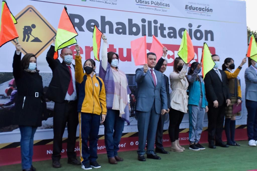 A temprana hora, el Alcalde acudió a la secundaria acompañado de autoridades educativas estatales para dar el banderazo de salida a los trabajos de rehabilitación en el plantel, que consisten en la reparación de pisos, impermeabilización de 752 metros cuadrados, cambio de 385 lámparas, con un costo de poco más de dos millones de pesos.