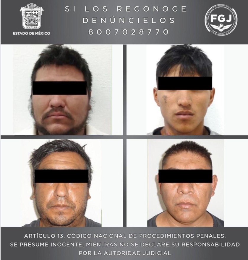 Por ello con los datos recabados, personal de esta Fiscalía estatal se trasladó e incursionó en un inmueble ubicado en la colonia Corte San Pablo, en el municipio de Chimalhuacán; dentro de un vehículo Volkswagen, tipo Vento, fue hallada la víctima, en tanto que fueron detenidos Carlos Abraham “N” de 45 años, Armando “N” de 37 años, Jorge Jaciel “N” de 28 años y Luis Ángel “N” de 19 años.