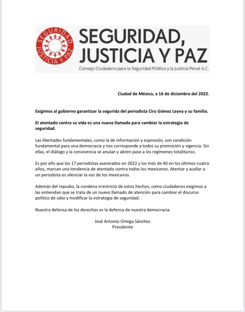 Ciudad de México, Mexico, 16 diciembre 2022.- El Consejo Ciudadano para la Seguridad Pública y la Justicia Penal, A.C. hizo público un comunicado en el que exige al gobierno garantizar la seguridad del periodista Ciro Gómez Leyva y su familia.