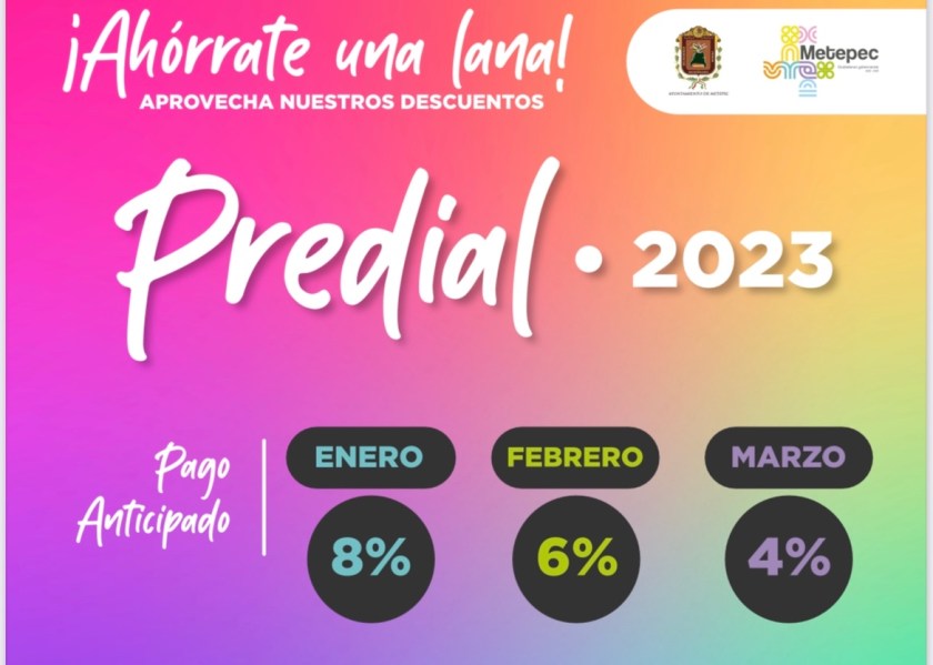 Durante los meses de enero, febrero y marzo se podrán obtener descuentos del 8%, 6% y 4%, respectivamente, sobre el importe total del pago anual anticipado del Impuesto Predial, del Ejercicio Fiscal 2023.