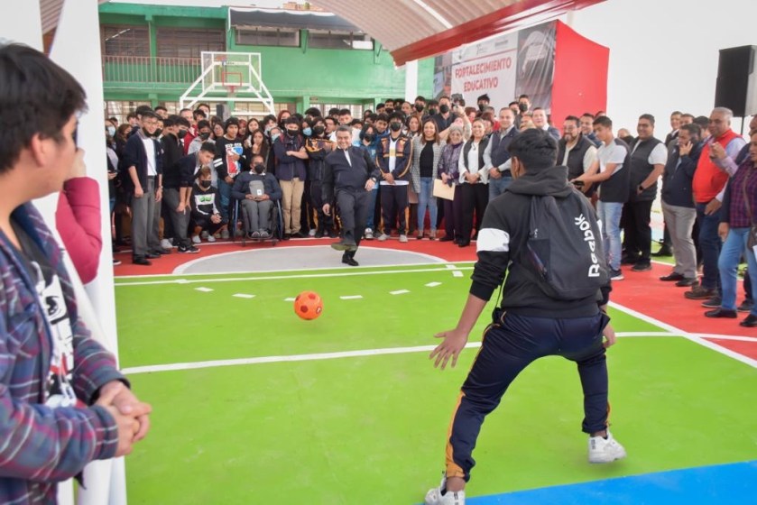 Tlalnepantla de Baz, Estado de México, 08 febrero 2023.- Con el cobro de penales y tiros de basquetbol, el Alcalde Marco Antonio Rodríguez Hurtado inauguró las obras de construcción de arcotechos y las canchas nuevas de las escuelas primaria «Justo Sierra» y la preparatoria oficial 103 de Tlalnepantla, que representó una inversión de 3 millones 311 mil 33 pesos, a fin de que los estudiantes del municipio cuenten con las herramientas necesarias para que no dejen de prepararse y puedan enfrentar, de mejor manera, los retos del futuro.