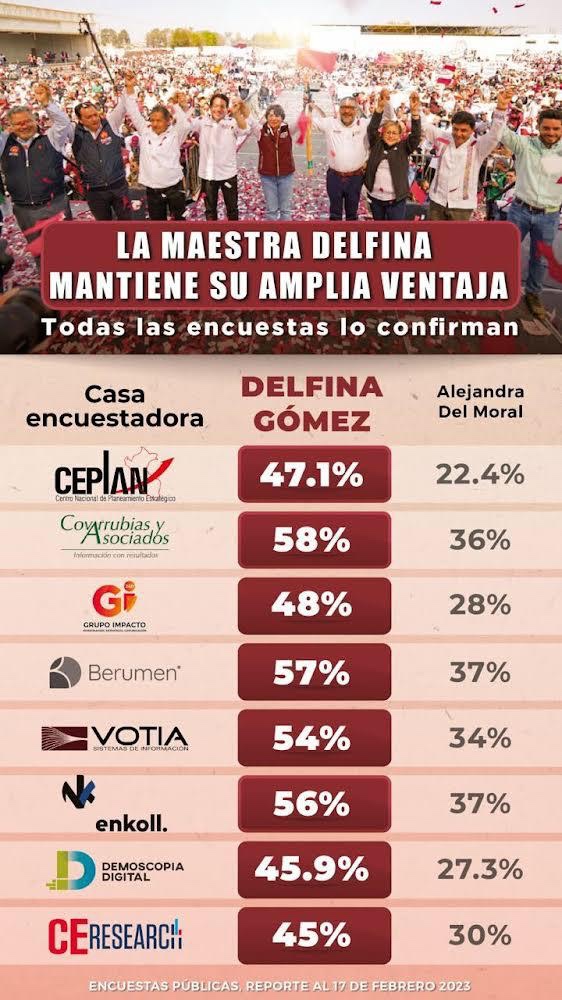 De acuerdo con una revisión de todas las empresas encuestadoras más prestigiosas en México, la maestra Delfina Gómez Álvarez, próxima candidata de MORENA a gobernadora del Estado de México, registra una ventaja promedio de 20 puntos en las más recientes mediciones de la opinión pública.