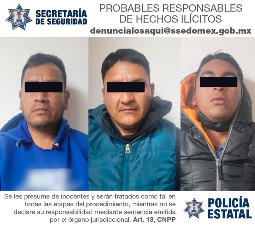 Por este motivo y después de leer los derechos que otorga la ley, se llevó a cabo la detención de los individuos que tripulaban el vehículo llamados Iván «N», Erick «N» y Agustín «N» de 37, 43 y 25 años de edad, respectivamente, quienes fueron trasladados a la Agencia del Ministerio Público con sede en Metepec, a fin de seguir las indagatorias y determinar su situación legal.