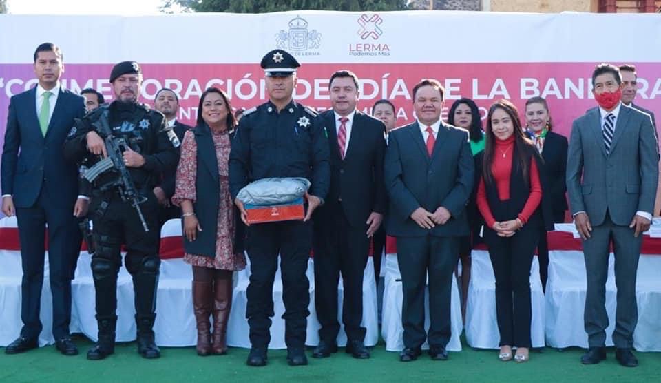 El presidente municipal de Lerma, Miguel Ángel Ramírez Ponce, entregó uniformes a 140 agentes de las direcciones de Seguridad Pública y de Tránsito y Vialidad de Lerma, como parte de la conmemoración del Día de la Bandera.