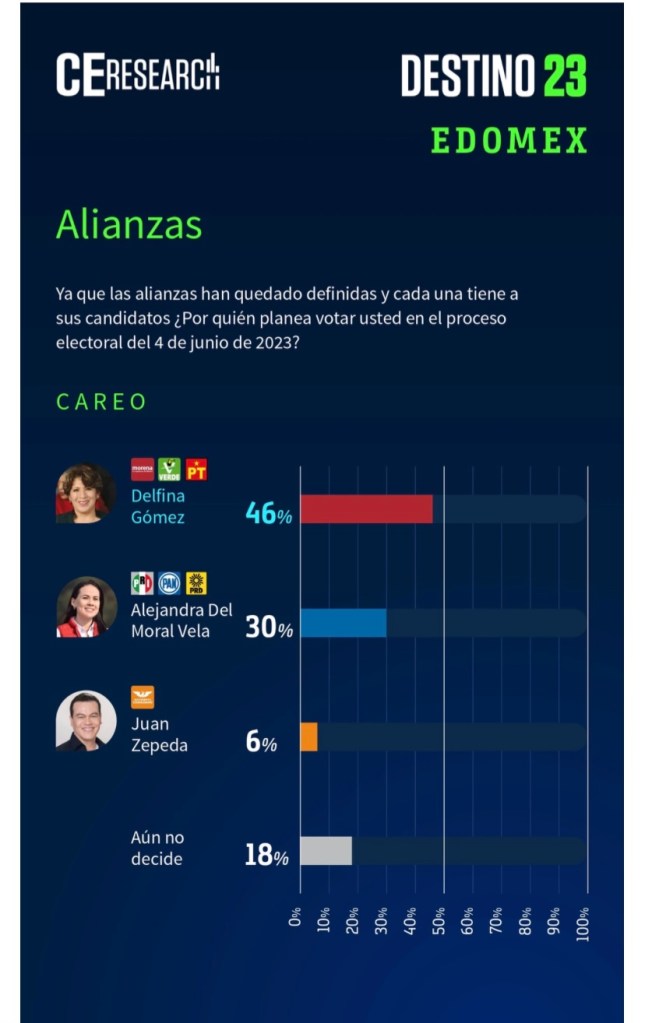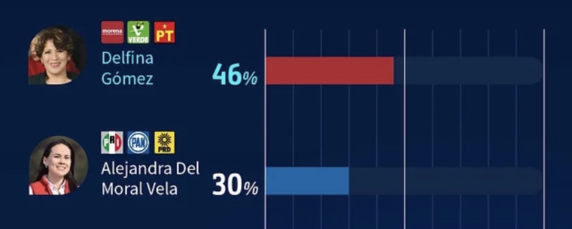 El partido Morena en el Estado de México dio a conocer la encuesta realizada por Campaigns&Elections, publicada este 27 de febrero, que establece un aumento de 15 a 16 puntos de ventaja en intención del voto para Delfina Gómez Álvarez, sobre Alejandra del Moral, del PRI.
