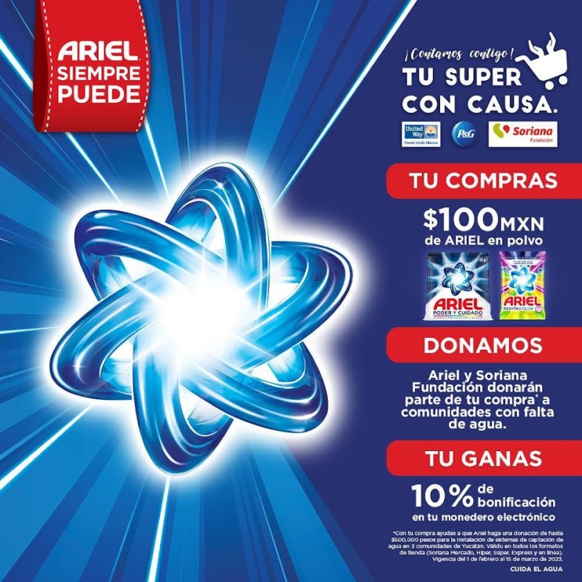 Cabe destacar que esta campaña aplicará en 606 tiendas correspondientes a los formatos Express, Híper, Súper, Mercado, durante todo el mes de febrero y hasta el 15 de marzo de 2023, por cada $100 pesos de compra en detergentes Ariel en polvo, P&G junto con Soriana Fundación destinarán un donativo total de hasta $500 mil pesos al proyecto.