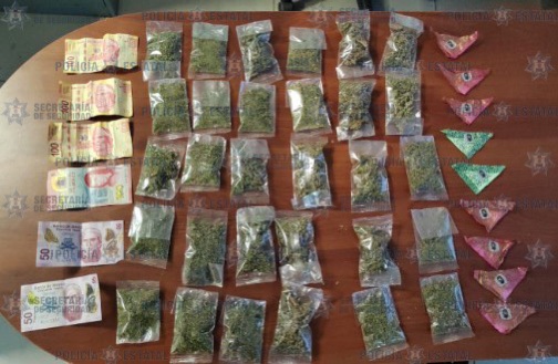Al efectuar una revisión protocolaria, hallaron entre sus pertenencias 39 bolsas pequeñas de una hierba con características similares a la marihuana, dos dosis de aparente cocaína, siete envoltorios con probable cristal y dinero en efectivo. Cabe señalar que, de acuerdo a las primeras indagatorias, los detenidos podrían ser integrantes de un grupo delictivo con orígenes en el estado de Jalisco, dedicados a la distribución de drogas, por lo que se extenderán las averiguaciones.