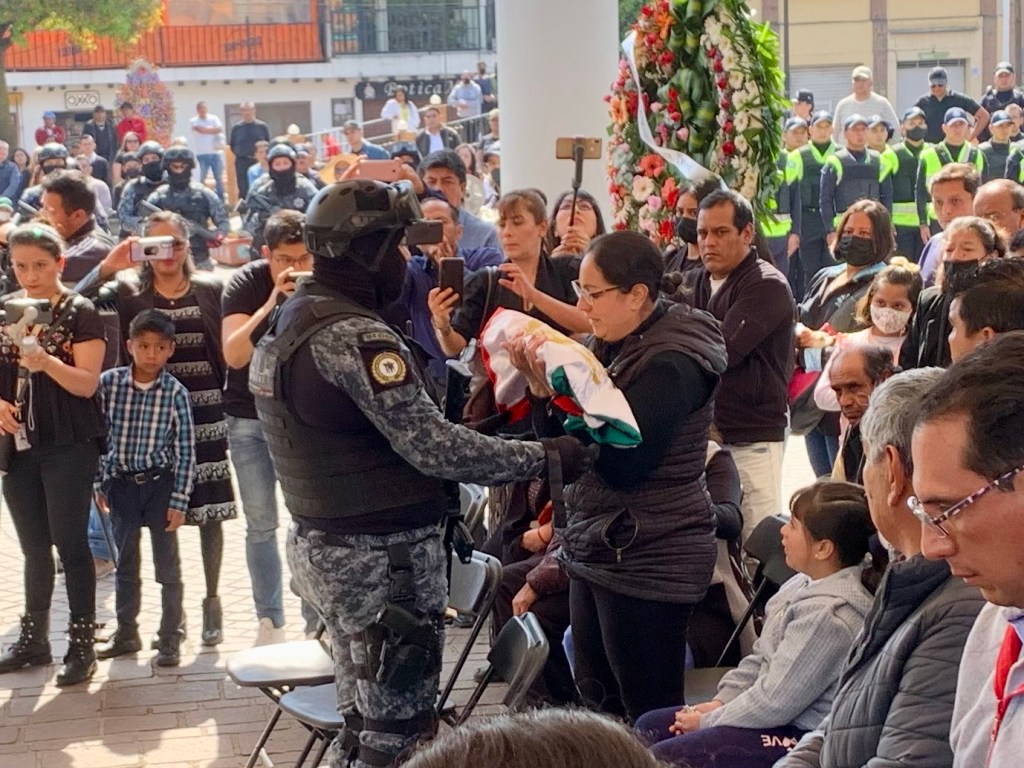 Honores sinceros para el uniformado que enfrentó a la delincuencia para proteger y salvar la vida de personas inocentes. Noé, ejemplo de una carrera policiaca profesional y eficiente. A un costado del ataúd, la bandera de México ondea a media asta, por la lamentable pérdida. Otra bandera nacional en el féretro, junto a la bandera del agrupamiento de Noé, es retirada para entregarla a su esposa, a la familia, como símbolo de honor, respeto y solidaridad. Es la bandera que recuerda a Noé, al Ejemplar Servidor Público, al Héroe y al Policía.