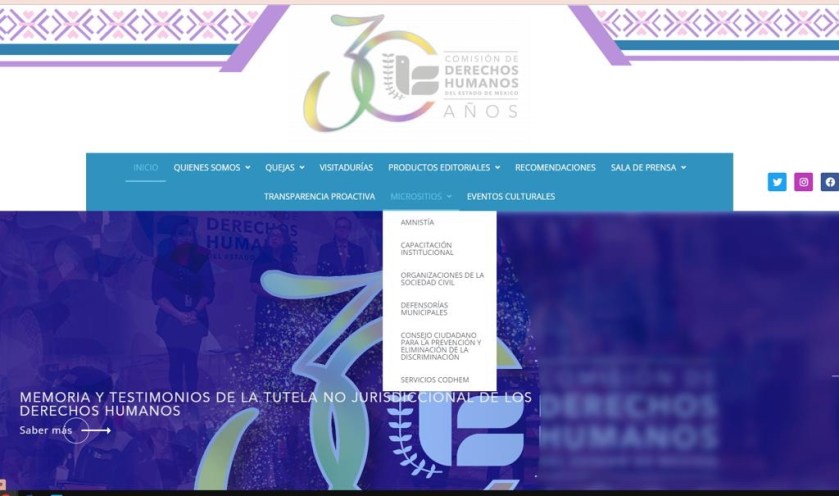 Toluca, Estado de México, 18 de abril de 2023.- Con una política firme de transparencia y poner al alcance de la ciudadanía información respecto a la promoción de la cultura de respeto y defensa de la dignidad humana, la Comisión de Derechos Humanos del Estado de México (CODHEM) cuenta con siete Micrositios en la página oficial http://www.codhem.org.mx, en materia de Servicios, Amnistía, Transparencia Proactiva, Capacitación Institucional, Organizaciones de la Sociedad Civil, Defensorías Municipales y el Consejo para la Prevención y Eliminación de la Discriminación.