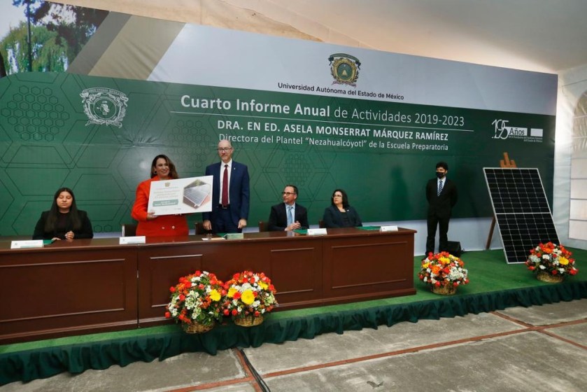 - El rector de la UAEMéx, Carlos Eduardo Barrera Díaz, entregó 12 paneles solares al Plantel “Nezahualcóyotl” de la Escuela Preparatoria.