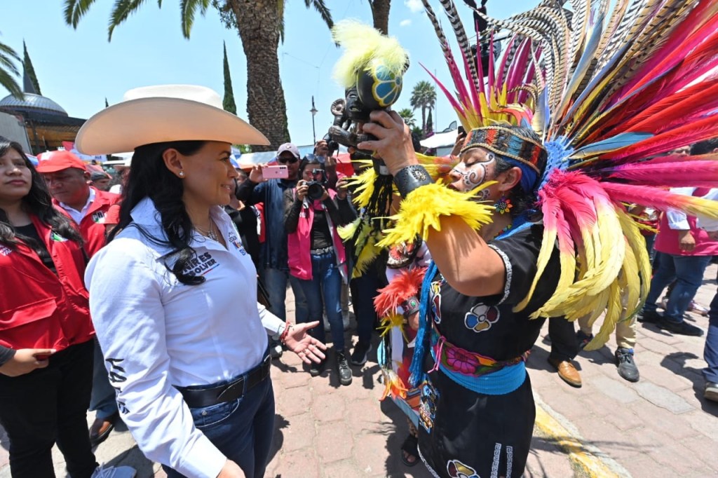 Más tarde, danzantes teotihuacanos de San Martín de las Pirámides le dieron la bienvenida a Alejandra Del Moral Vela, en donde refrendó su compromiso por la unidad mexiquense en las próximas elecciones.