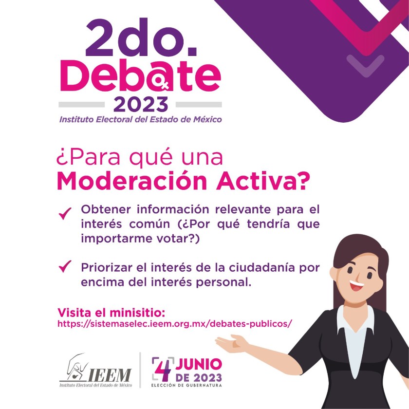 El Segundo Debate Público entre las candidatas a la Gubernatura del Estado de México, Paulina Alejandra del Moral Vela de la Coalición “Va por el Estado de México” y Delfina Gómez Álvarez de la Candidatura Común “Juntos Hacemos Historia en el Estado de México” mantendrá un rol de moderación activa.