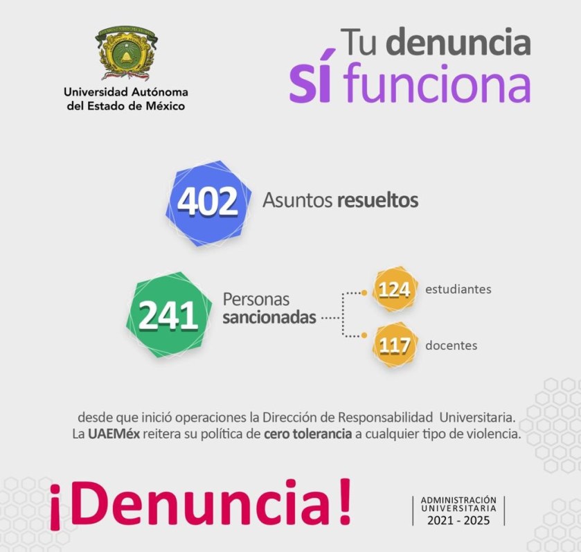 La administración 2021-2025, ha impulsado acciones certeras y eficaces ante casos de violencia y acoso, por ello cuenta con modernos procedimientos y normas que sancionan la vulneración de los derechos universitarios y humanos. Además, se ha contratado y capacitado a personal especializado para dar seguimiento a las denuncias de acoso, hostigamiento, violencia sexual, cyberbullying y bullying, consideradas faltas graves.