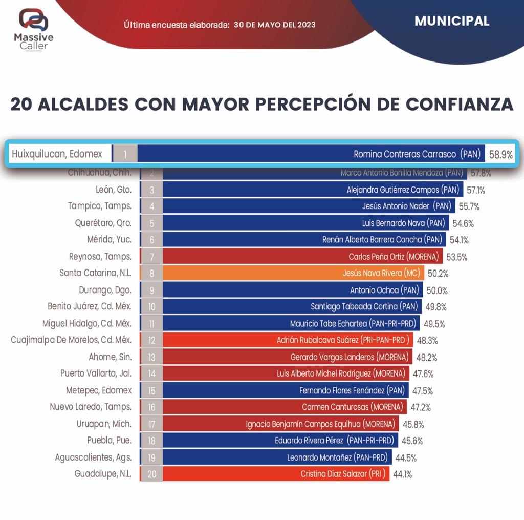 Asimismo, en el Ranking Nacional de la empresa Massive Caller, correspondiente a mayo, Romina Contreras obtuvo una calificación de 58.9 por ciento en cuanto a la percepción de confianza, lo que la posiciona en primer lugar a nivel nacional entre los 124 alcaldes incluidos en dicha encuesta y entre sus homólogos del Estado de México, y de 70.5 por ciento en cuanTo a la aprobación ciudadana, situándose entre los tres alcaldes mejor calificados del país.