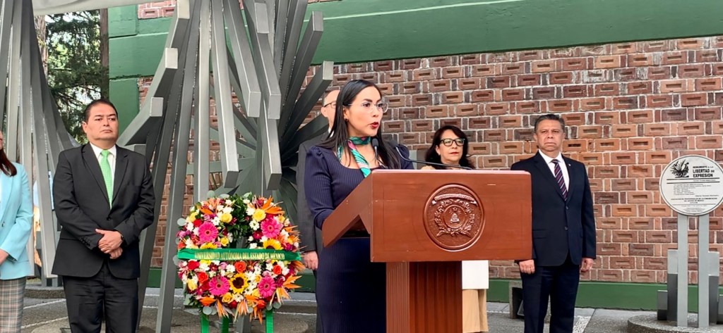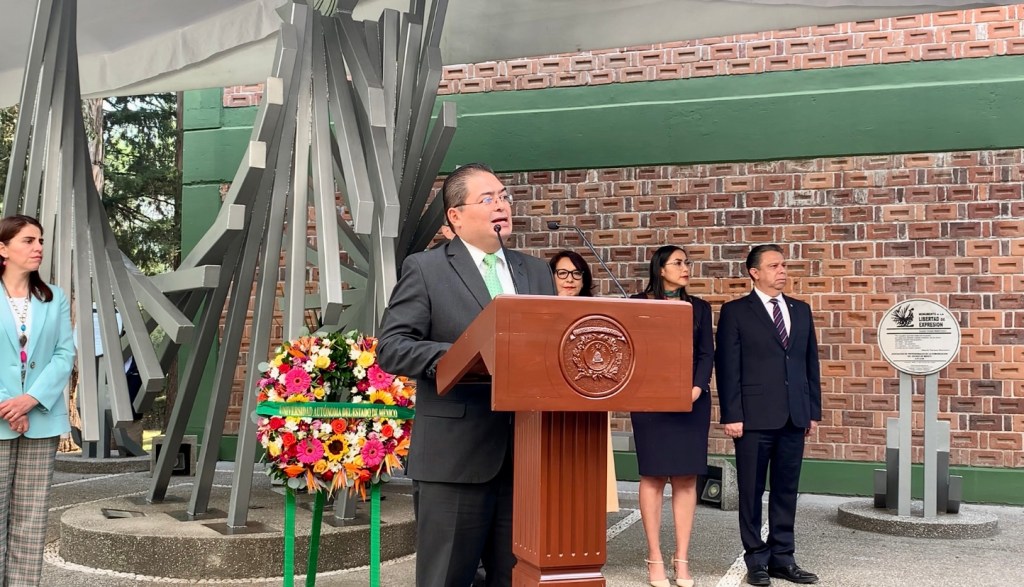 Durante su intervención, la directora General de Comunicación Universitaria, Ginarely Valencia Alcántara, destacó que este monumento surgió de una inquietud de la Asociación de Mujeres Periodistas del Valle de Toluca por tener un lugar de encuentro cada 7 de junio, día en que se conmemora la Libertad de Expresión a nivel nacional. A 21 años de su instalación, este monumento se ha consolidado como un icono de la Facultad de Ciencias Políticas y Sociales, que en sus aulas forma profesionistas y profesionales de la comunicación promotores innatos de este derecho que permite construir sociedades democráticas.