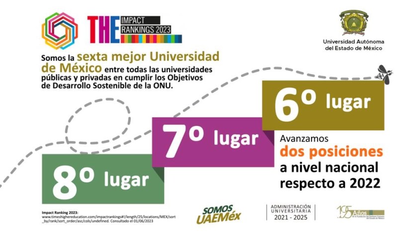Toluca, Méx; 07 de junio de 2023. Por el éxito del trabajo y acciones que la Universidad Autónoma del Estado de México (UAEMéx) realiza para contribuir al cumplimiento de los Objetivos de Desarrollo Sostenible (ODS) de la Agenda 2030 de la Organización de las Naciones Unidas (ONU), THE Impact Ranking 2023 la ubicó en la sexta posición nacional entre las Instituciones de Educación Superior (IES) públicas y privadas.