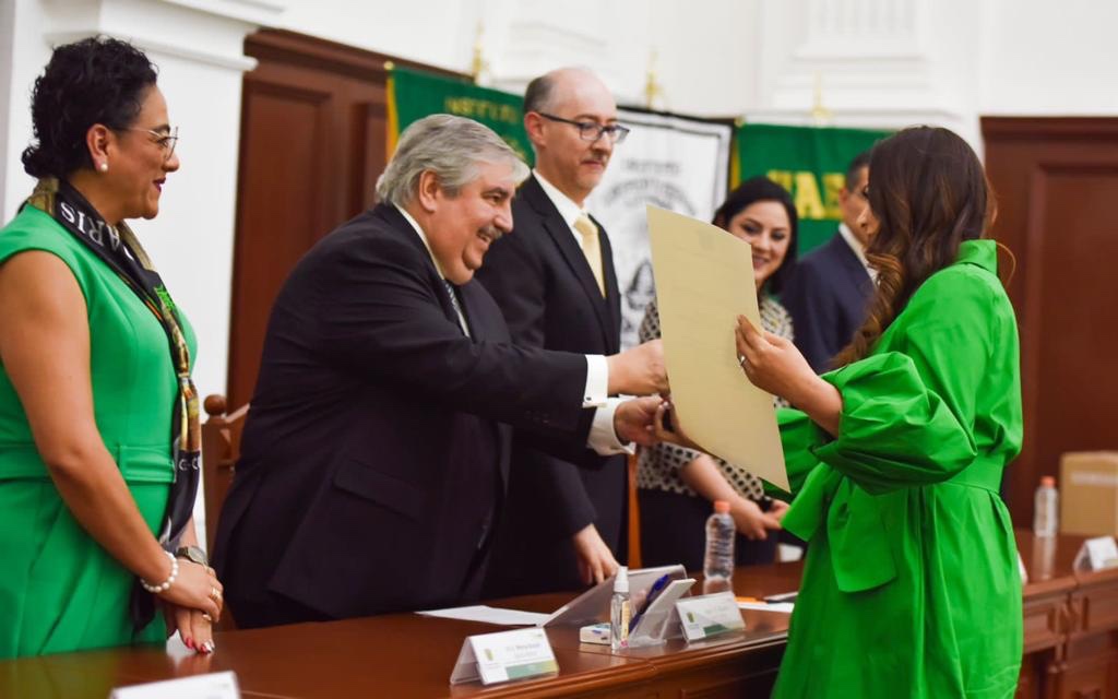 La presidenta de la CODHEM agradeció a la directora de la Facultad de Derecho María José Bernáldez Aguilar por proponerla para recibir el reconocimiento, así como a sus maestras y maestros por ser fuente de inspiración para dar sentido y aprecio de su absoluta dedicación y desprendimiento para construirlas como personas de bien para la sociedad.