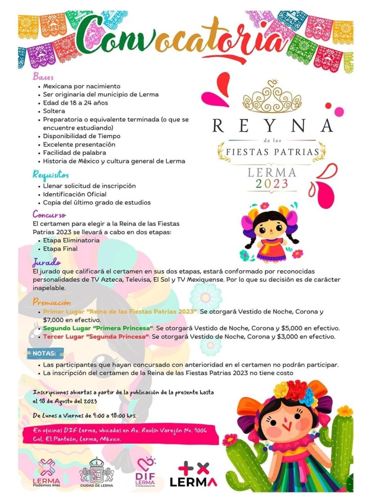Con el propósito de resaltar no sólo la belleza de la mujer lermense, sino también el amor por su municipio y por la comunidad a la que pertenecen, el DIF Lerma dio a conocer la convocatoria para participar en el certamen Reyna de las Fiestas Patrias Lerma 2023.