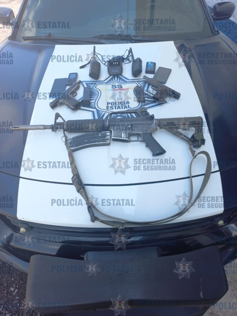 De inmediato, con la información obtenida, las fuerzas de seguridad se trasladaron a la zona y visualizaron a los aparentes objetivos. Luego de hacer contacto, apegados estrictamente al protocolo de actuación efectuaron una revisión y encontraron, un arma de fuego larga tipo AR-15, color negro con un cargador; dos armas de fuego cortas, color negro, con dos cargadores; dos radios portátiles y dos teléfonos celulares.