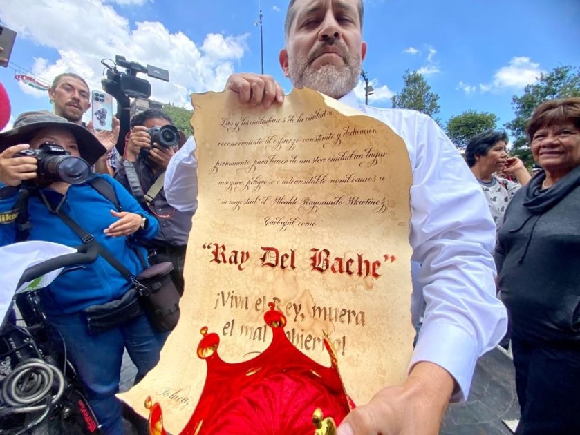 Medina Peralta expuso un tipo pergamino, en cual externaba que la ciudadanía percibe un municipio inseguro, peligroso e intransitable, por la cantidad de baches que hay en casi todas las delegaciones; por eso, “nombramos a su majestad el alcalde Raymundo Martínez Carbajal, como Ray del Bache, este es un sentimiento generalizado que está en toda la ciudad y vale mucho la pena estarlo replicando”.
