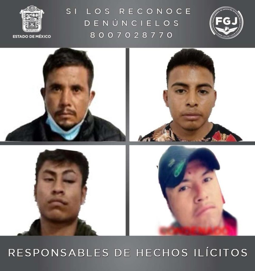 Toluca, Estado de México, 10 septiembre 2023.- La Fiscalía General de Justicia del Estado de México (FGJEM) obtuvo sentencia de prisión vitalicia para José Juan Ceballos González, Luis Enrique Sánchez Armenta, Juan Pedro Díaz Armenta y José Rodrigo Guadarrama Téllez, quienes el 18 de marzo de 2021 participaron en el homicidio de ocho elementos de la Secretaría de Seguridad estatal (SSEM) y cinco agentes de la Policía de Investigación de esta Institución, en el municipio de Coatepec Harinas.