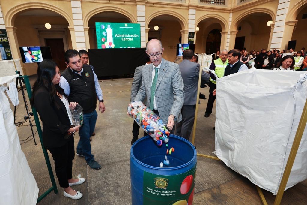 En este evento, que presidió el rector Carlos Eduardo Barrera Díaz, en el Patio del Centenario del Edificio de Rectoría, acudieron integrantes de la administración central universitaria para depositar en contenedores mil 400 kilogramos de envases de plástico y taparroscas.