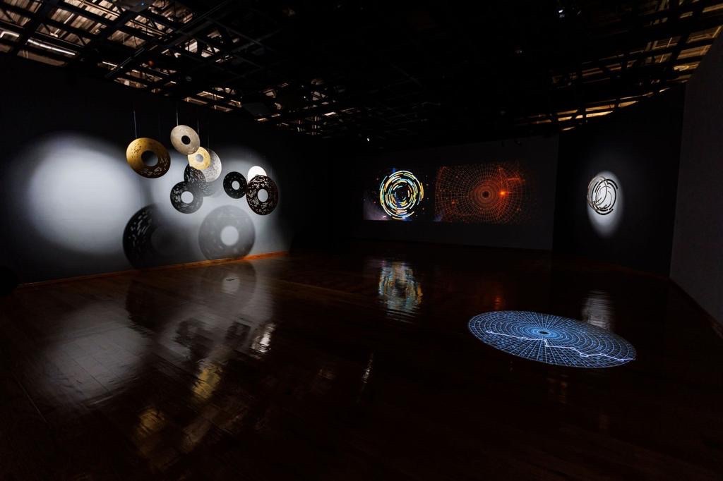 Cosmoloxías exhibe un conjunto de códices contemporáneos hechos con papel amate como parte de un diálogo entre el arte y la ciencia. Muestra mapas que constituyen el tejido del Universo, así como instalaciones que abordan el tema del universo mediante videos, sonidos y objetos que se activan con la luz y la sombra como parte importante de los conceptos centrales del propio cosmos.