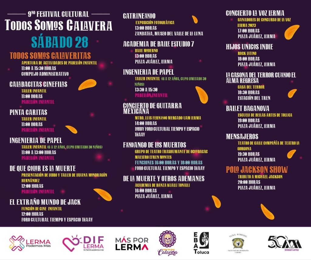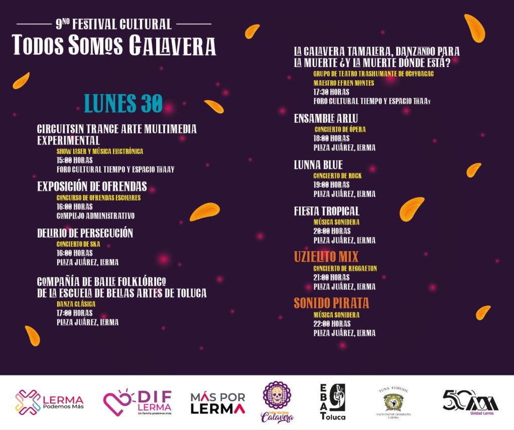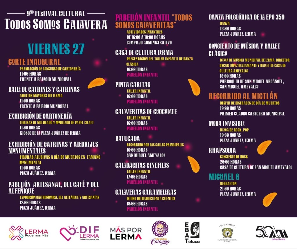 Este viernes, también a partir de las 11:00 horas, se llevará a cabo el evento de Exhibición de Cartonería, de Catrinas y Alebrijes Monumentales en el kiosco y en la Plaza Juárez de Lerma.